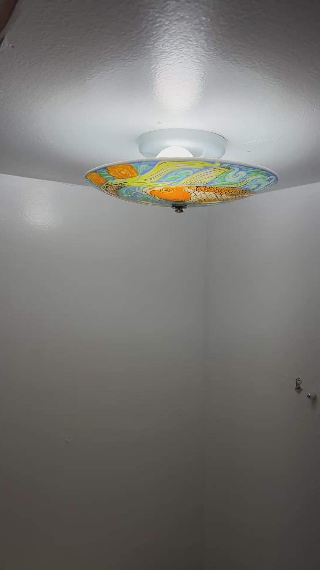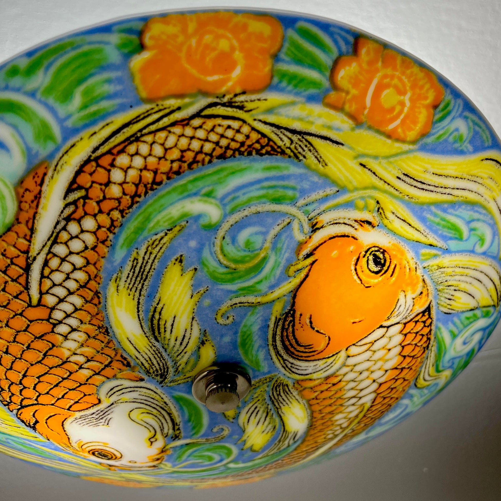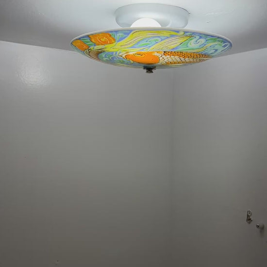 One of our new series of full color light designs, the Kiyomi Ceiling Light! These art glass ceiling light covers are mounted through a centered mounting hole and are designed to be used with standard household fixtures. A twin bulb fixture for 11 1/2" or triple bulb fixture for the 18" is available for an additional $15. The "Glass Only" option is shipped with the decorative connecting hardware included. All electrical components are UL listed.